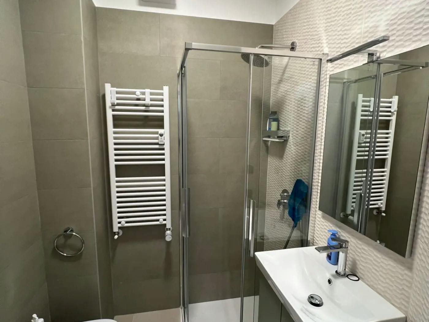 - Dettagli Funzionali: Un mobile lavabo color verde salvia/grigio oliva offre un tocco di colore moderno. La presenza di un termoarredo scalda salviette bianco, oltre a riscaldare, funge da pratico elemento di design.